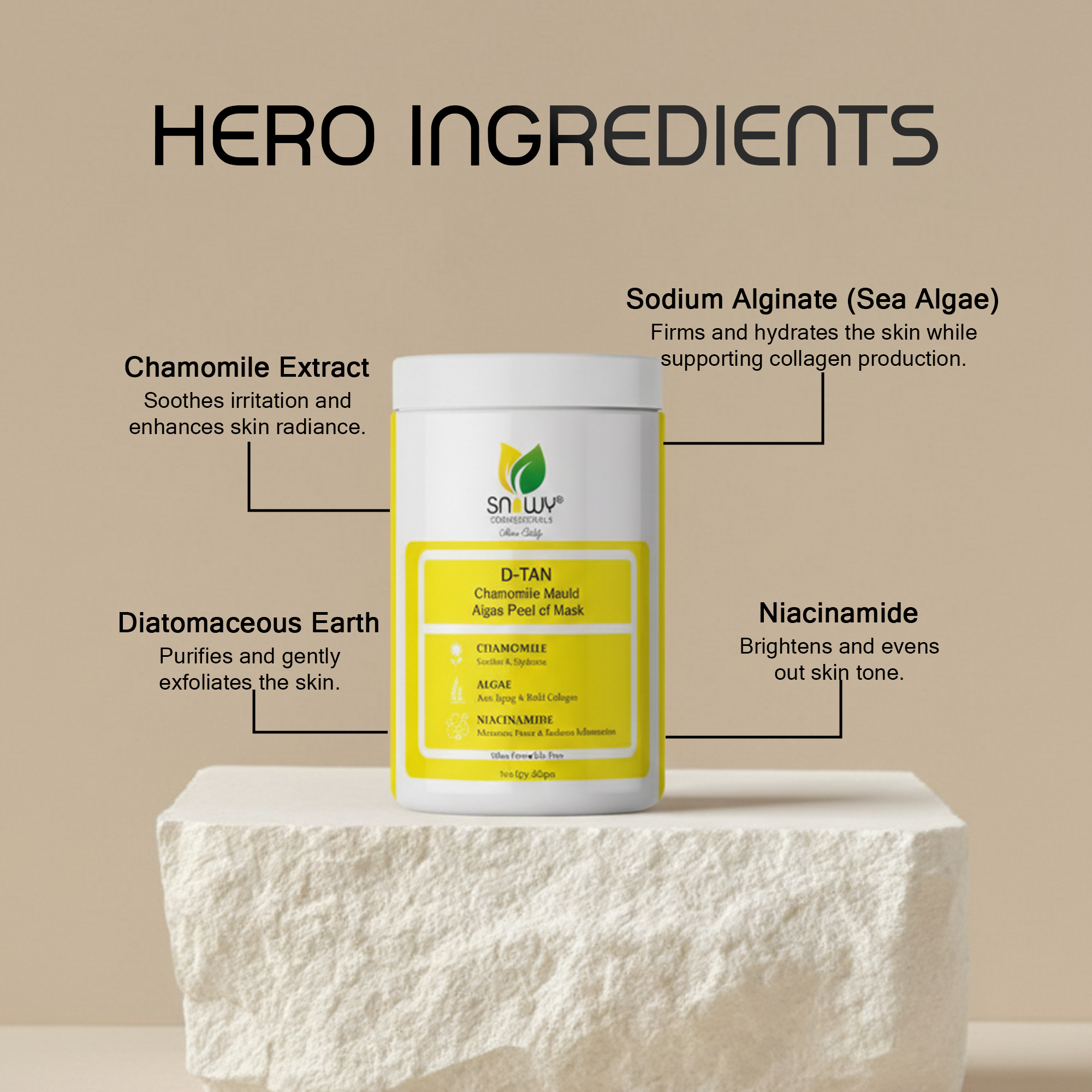D-TAN Chamomile Mould Algae Peel-Off Mask offers a luxurious, natural skincare ritual crafted for professional-grade results. Its ultra-fine powder blends effortlessly with water to form a smooth, flexible gel that moulds perfectly onto the skin, creating a second-skin occlusive layer that enhances active ingredient penetration. Powered by deep-sea alginates, the mask delivers intense hydration, improves firmness, and helps refine skin texture. Niacinamide works to brighten dull skin, reduce the appearance of tanning, and promote a more even skin tone, while marine algae support collagen activity for improved elasticity and vitality. Enriched with chamomile extract, the formulation calms inflammation, reduces redness, and soothes sensitive or stressed skin, making it ideal after sun exposure or advanced treatments. The gentle aromatic experience relaxes the senses while revitalizing the skin. With every use, skin feels refreshed, balanced, luminous, and visibly healthier, revealing a smooth, radiant, and well-nourished complexion.